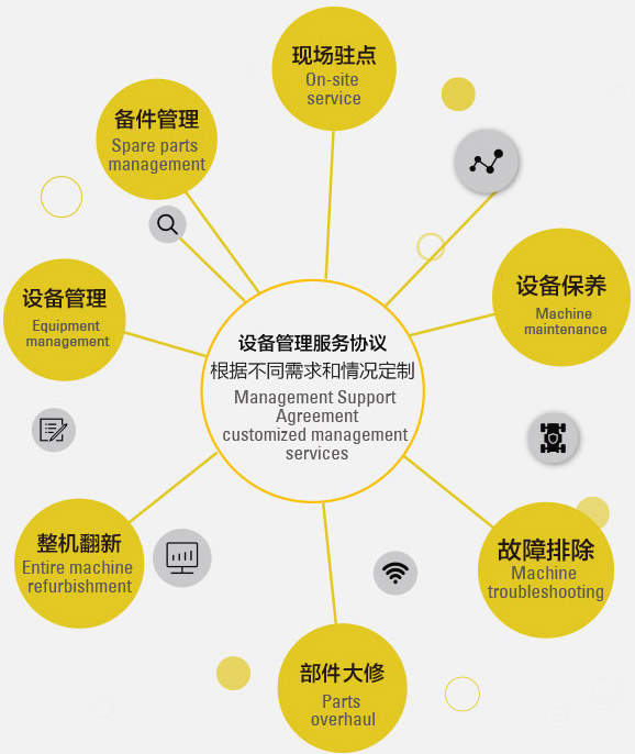 信昌可根據客戶需求提供定製化管理服務,可定製的內容除了 涵蓋設備管理的6 項(定期油樣分析、繞機檢查、技術分析、 遠程監測、底盤狀態檢測、綜合評估),還可以提供設備保養、 故障排除、部件大修、整機翻新、備件管理、現場駐點等服務。